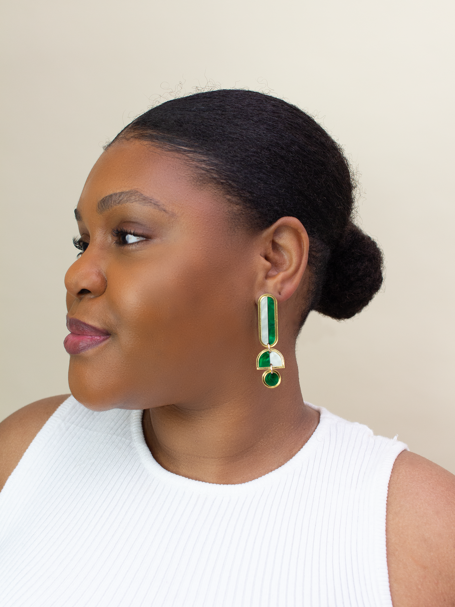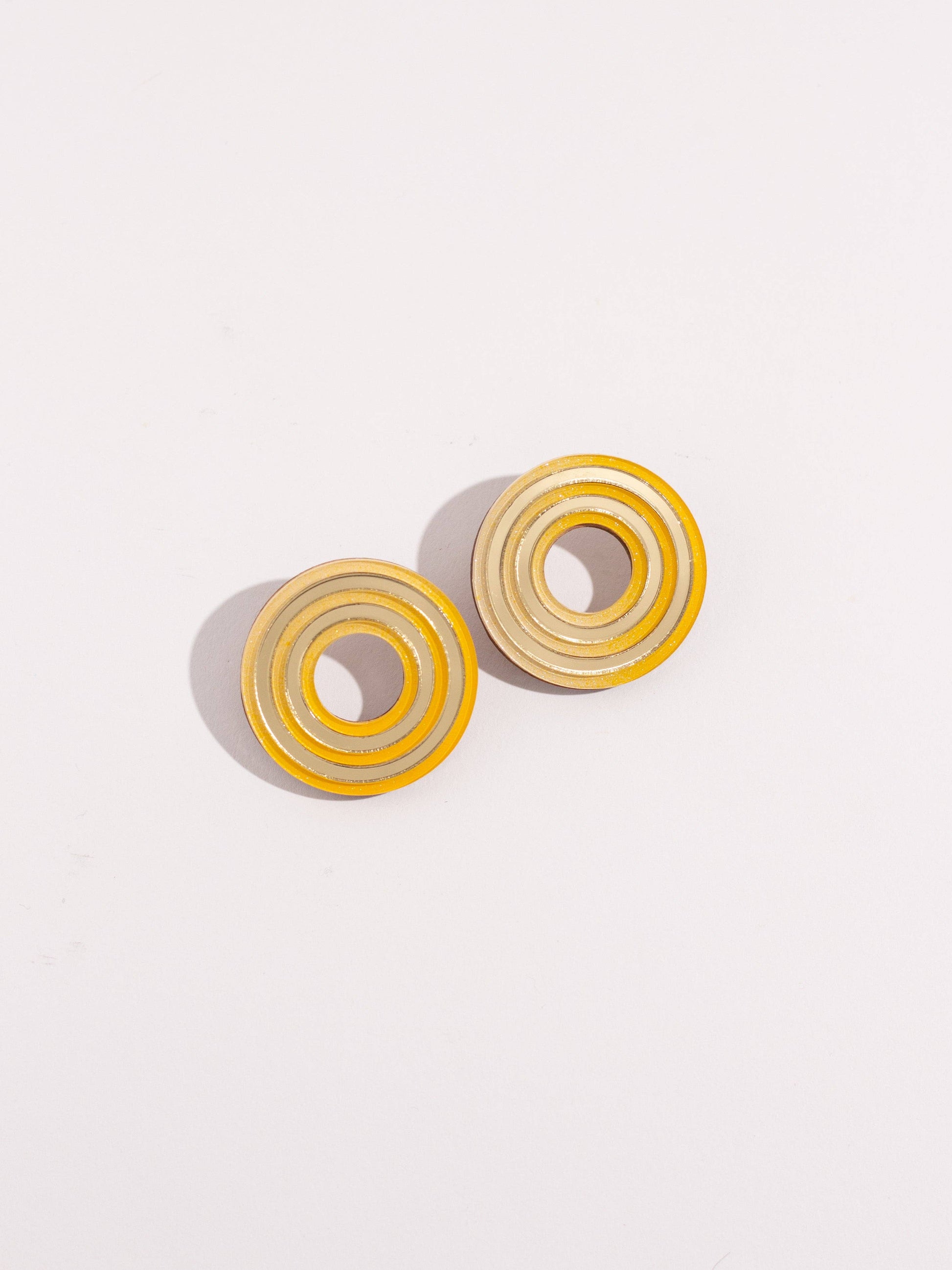 Key Features: Upcycled Acrylic with wood backing. Lightweight and comfortable. Made with titanium posts, Gold plated hardware, and butterfly backs.